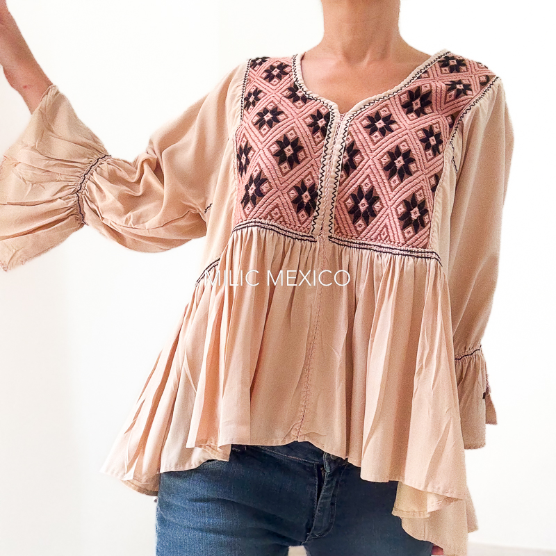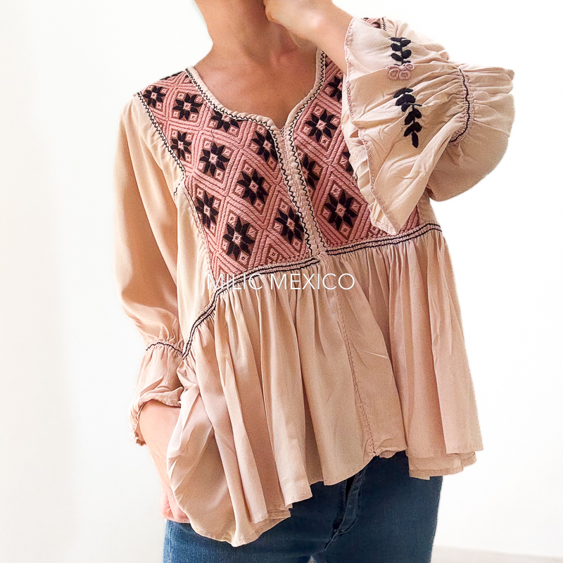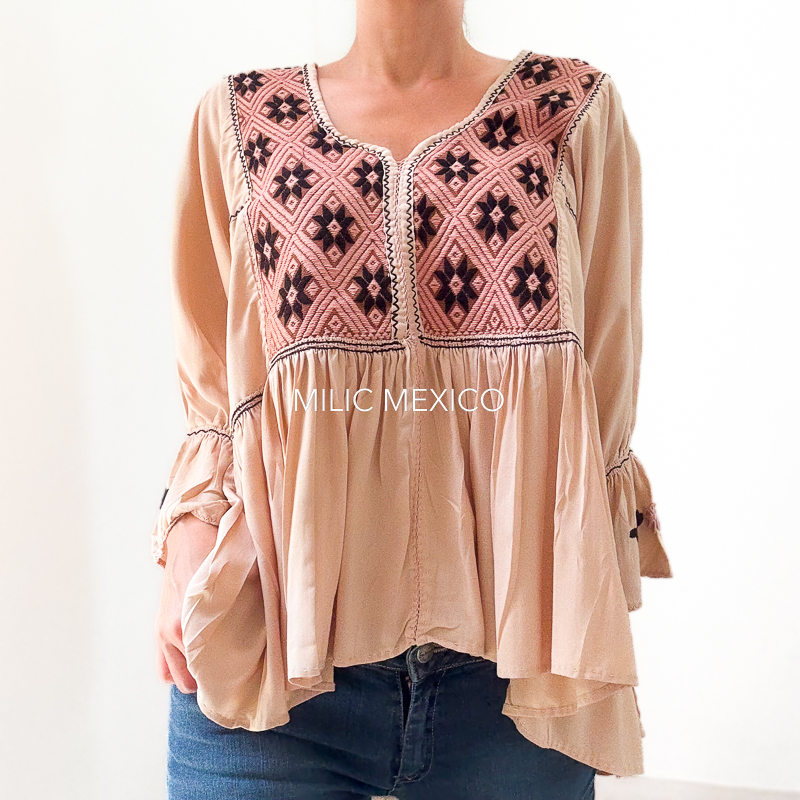 Blusas mexicanas artesanales hechas a mano en tela de rayón y pechera de textil de telar de cintura con detalles bordados. No pierdas la oportunidad de tener una prenda única.