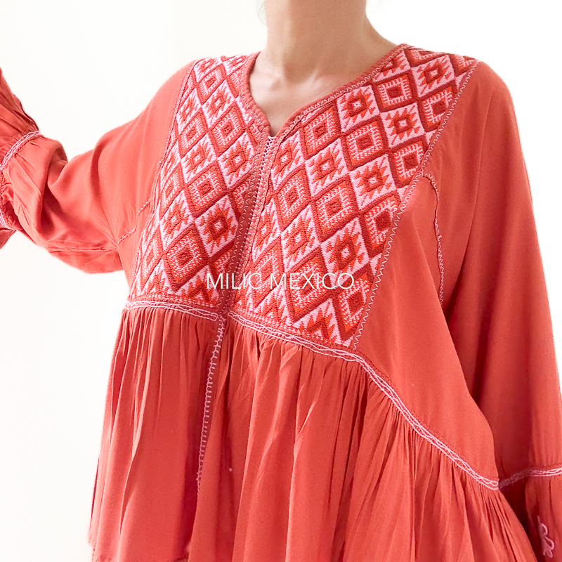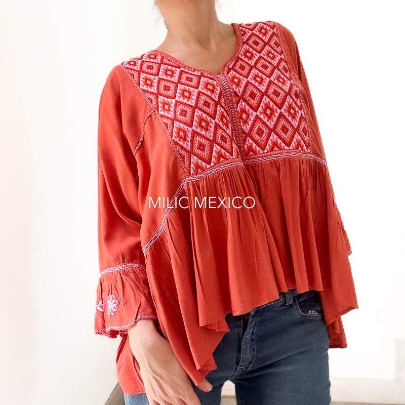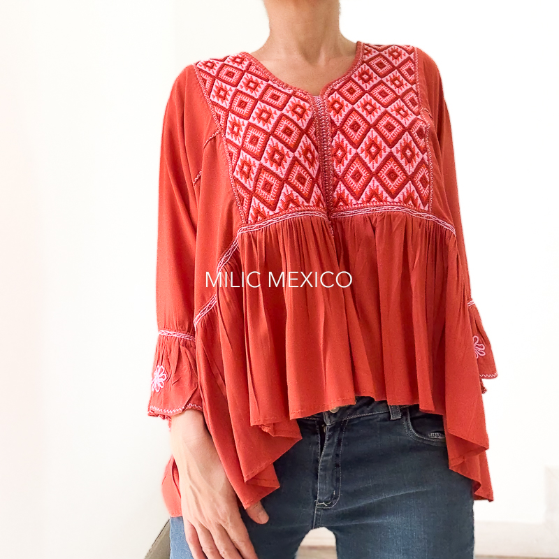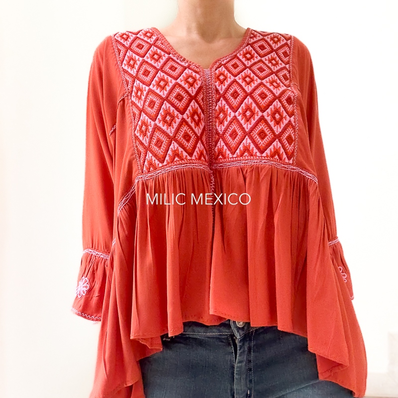 Blusas mexicanas artesanales hechas a mano en tela de rayón y pechera de textil de telar de cintura con detalles bordados. No pierdas la oportunidad de tener una prenda única.