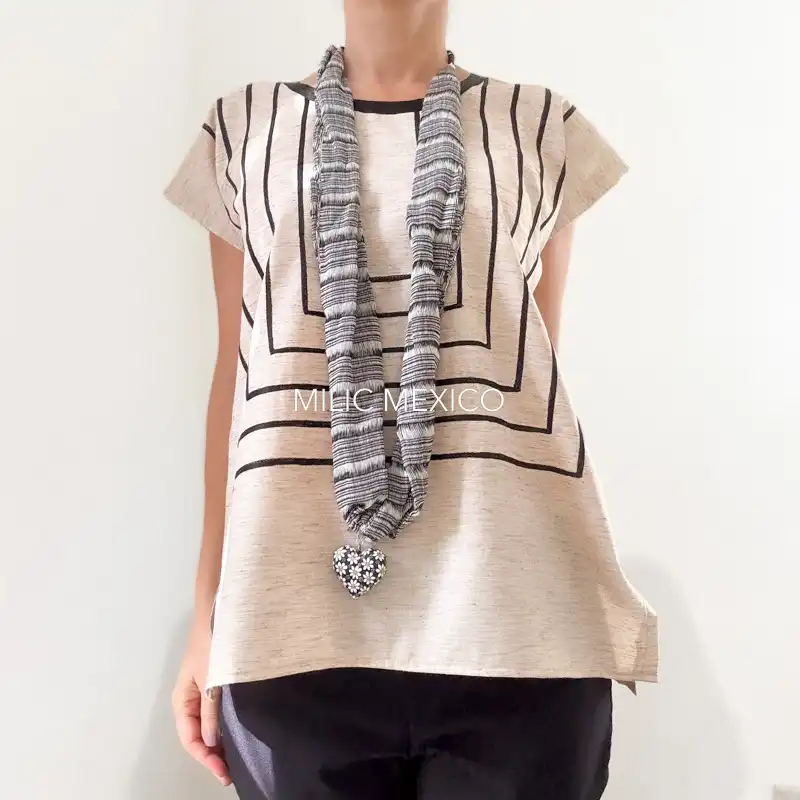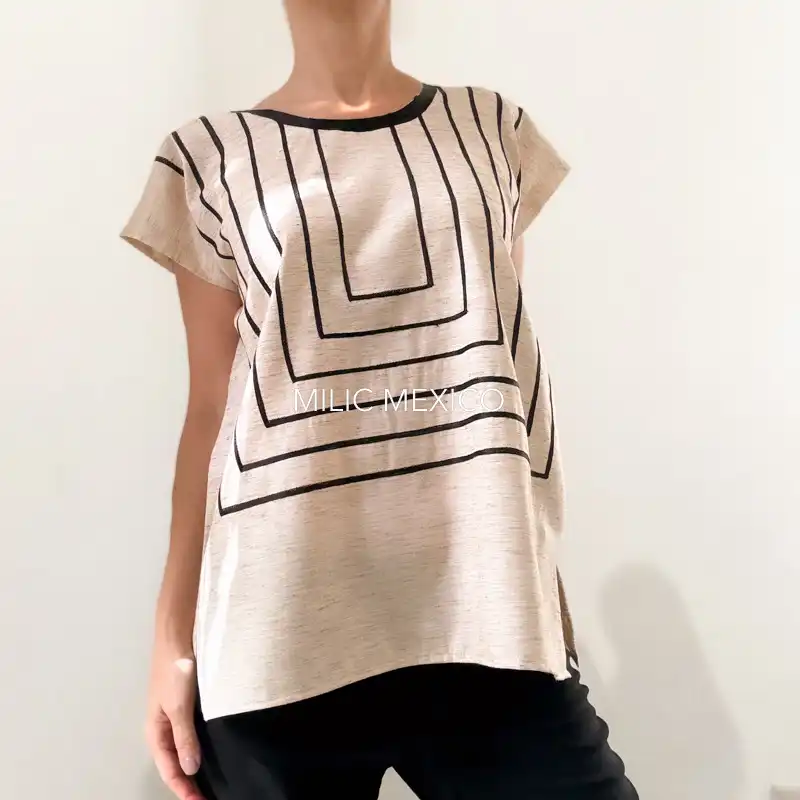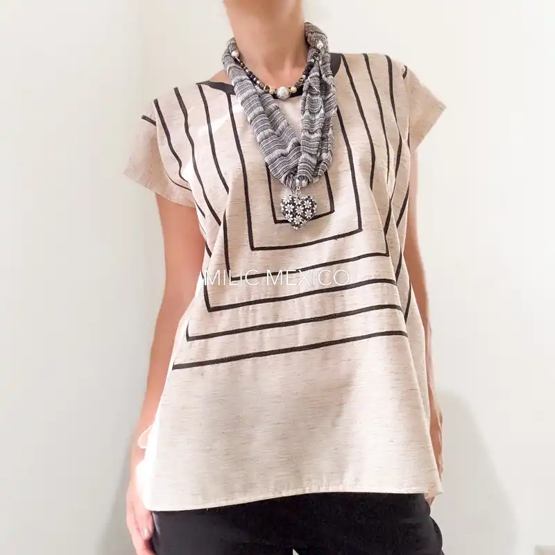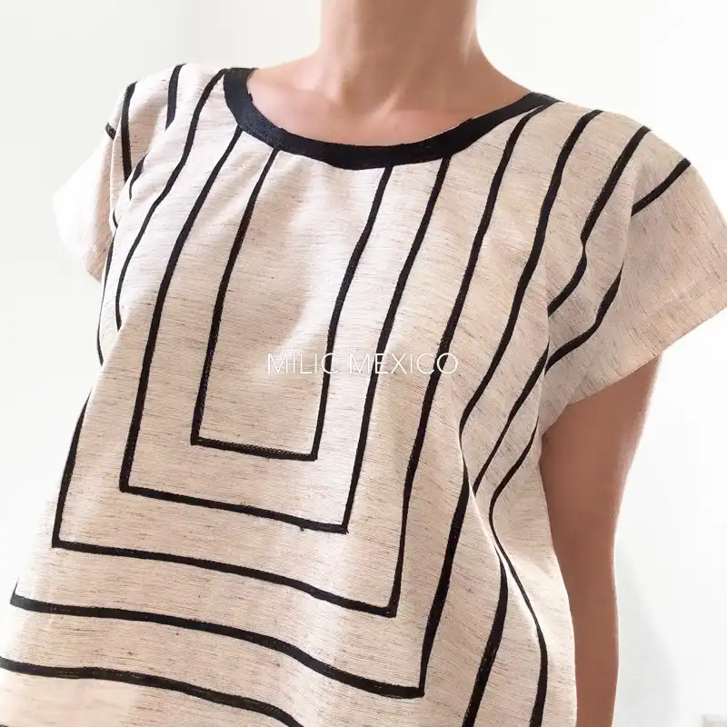 Blusas mexicanas artesanales para la mujer actual. Blusa de corte rectangular bordada a máquina de pedal en 6 líneas sobre tela de lino flamé. Origen de San Juan Guichicovi, Oaxaca.