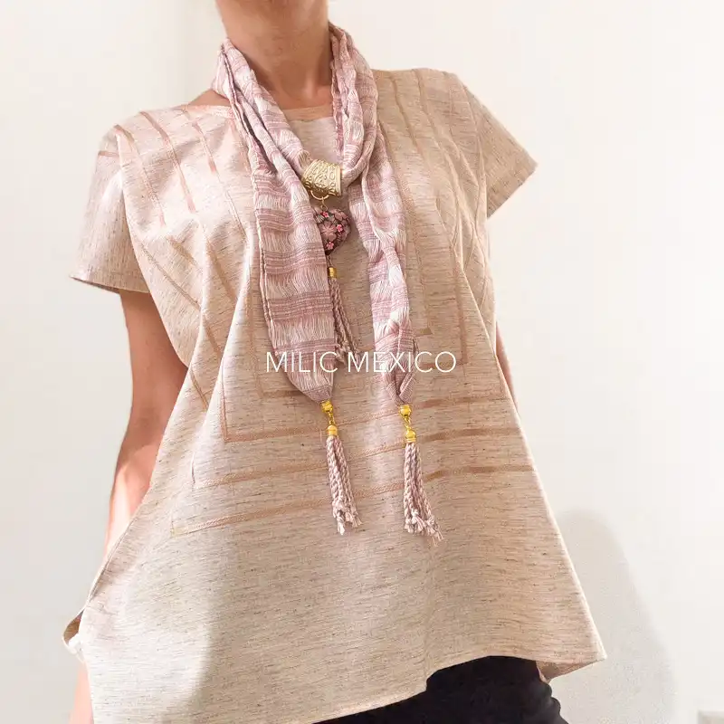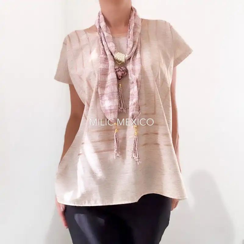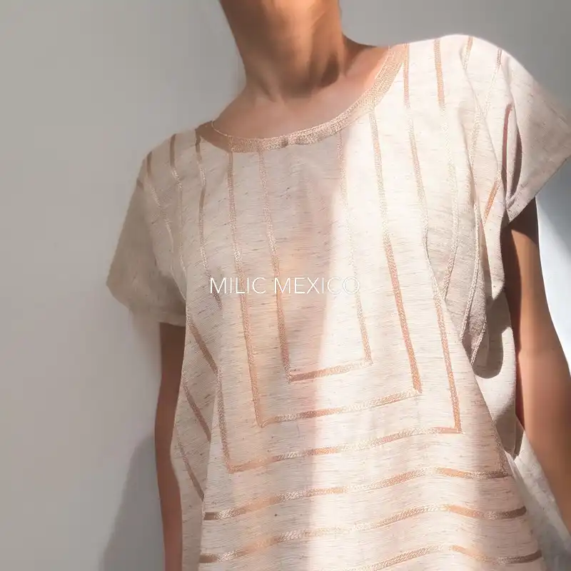 Blusas mexicanas artesanales para la mujer actual. Blusa de corte rectangular bordada a máquina de pedal en 6 líneas sobre tela de lino flamé. Origen de San Juan Guichicovi, Oaxaca.