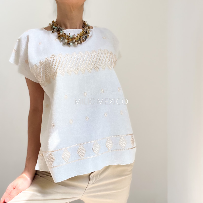 Blusón mexicano bordado ligero talla extra, tejido en telar de cintura y brocado en hilo de artisela o algodón de corte rectangular. Las artesanas que nos ayudan a crear estas piezas son de Paraíso de Grijalva, del municipio de Carranza, Chiapas. Lugar de clima cálido por lo que sus textiles son los más ligeros y frescos. Juntos colaboramos para diseñar piezas contemporáneas y versátiles.