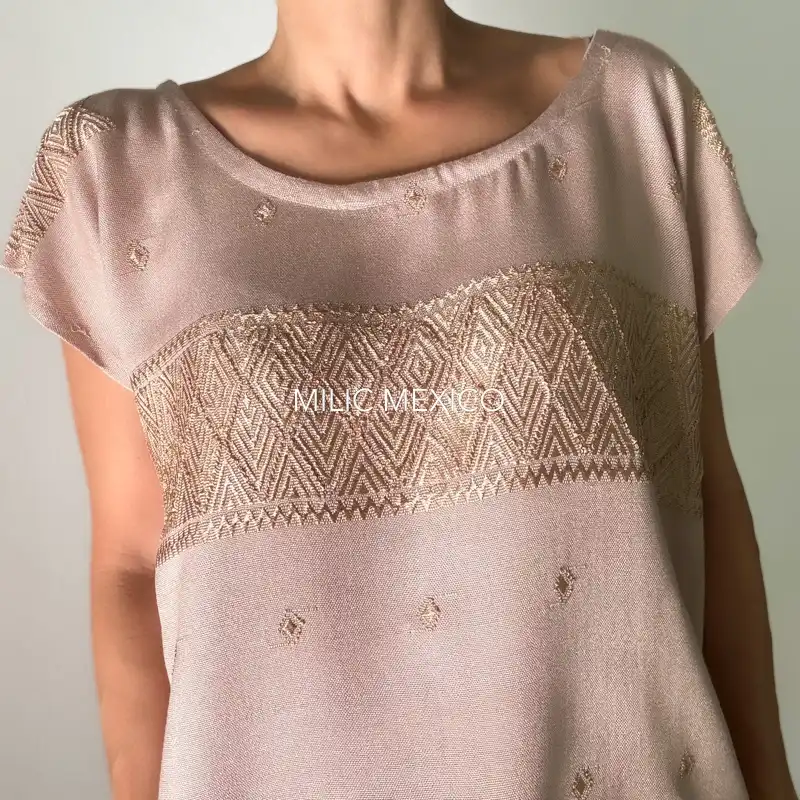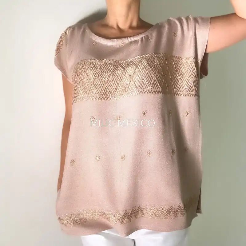 Blusa artesanal mexicana tejida en telar de cintura con hilo de rayón, de corte rectangular. Las artesanas que nos ayudan a crear estas piezas son de Paraíso de Grijalva, del municipio de Carranza, Chiapas. Lugar de clima cálido por lo que sus textiles son los más ligeros y frescos. Juntos colaboramos para diseñar piezas contemporáneas y versátiles.
