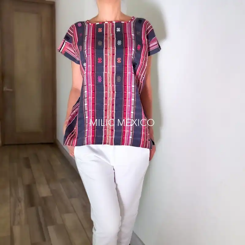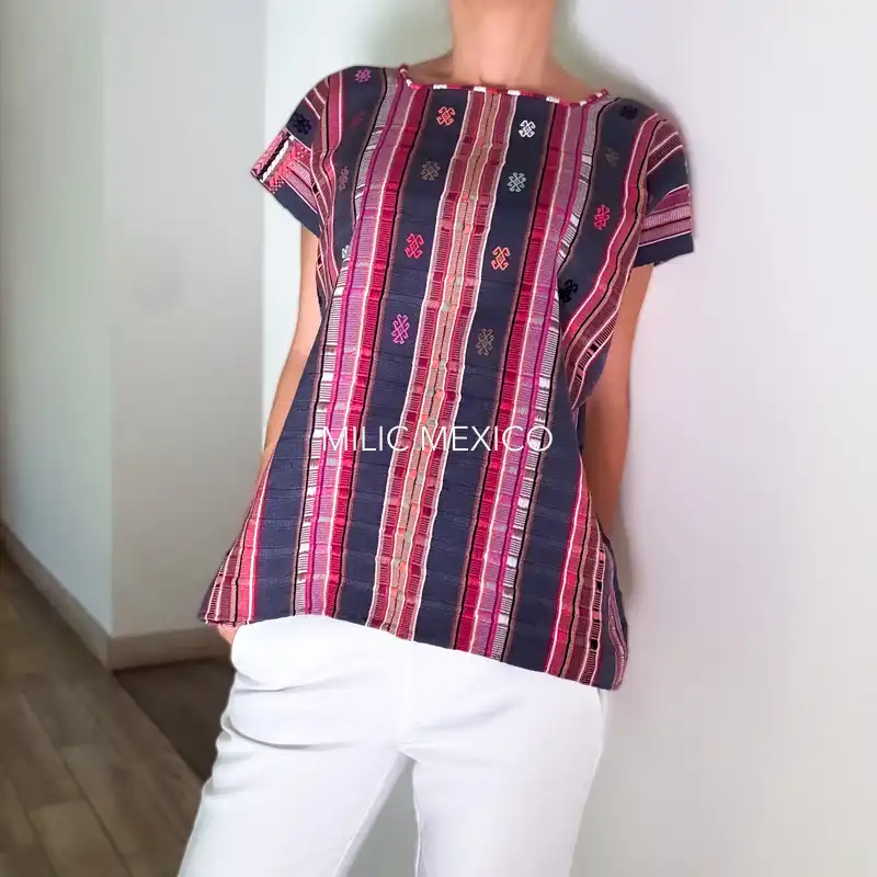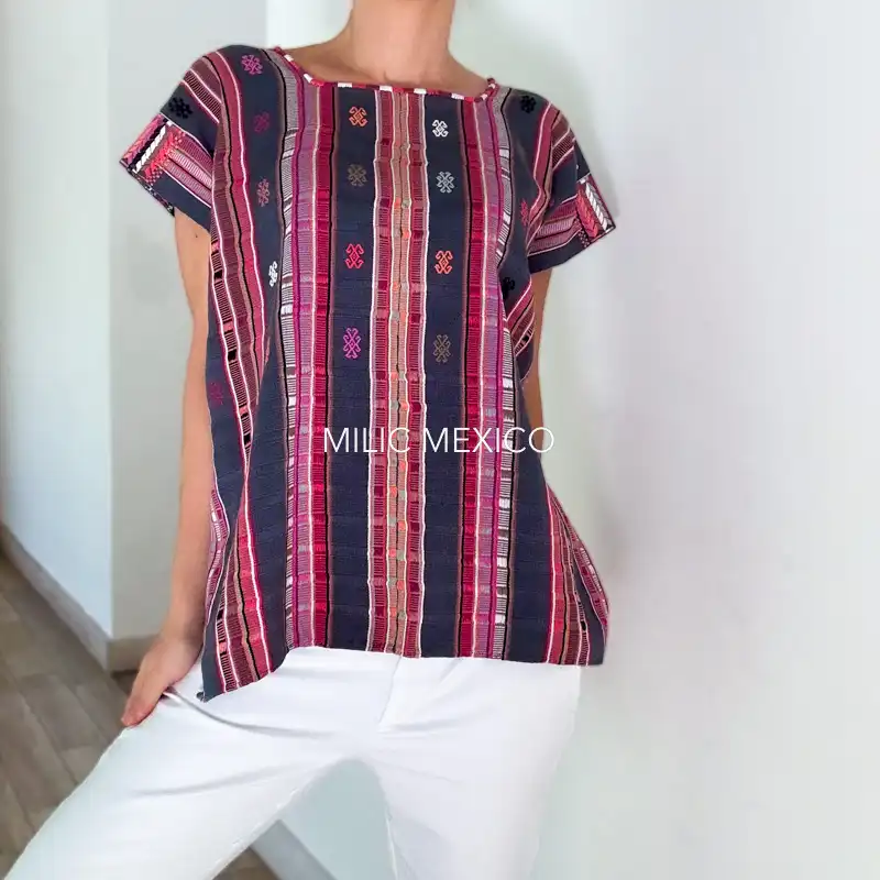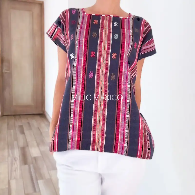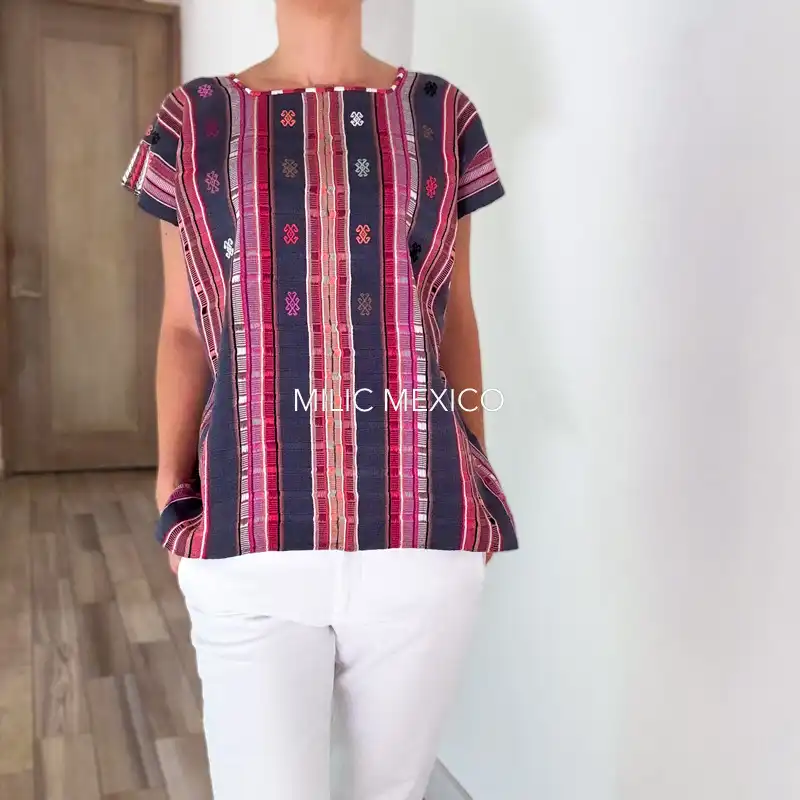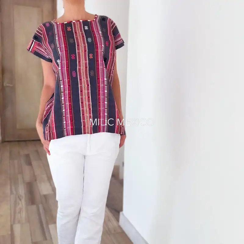 Blusón de telar bordado mexicano en dos lienzos con patrón de líneas verticales y pequeños diseños de brocados, tradicionales de esta comunidad chiapaneca. La joven artesana Guadalupe nació con el don de combinar exquisitamente los colores. Ella junto con su mamá, su hermana y sus tías crean en equipo con Milic nuevos diseños, siempre siguiendo los patrones tradicionales de su comunidad.