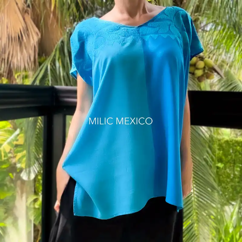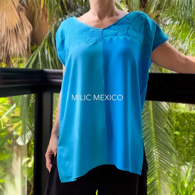 Las artesanas de Jalapa de Díaz en Oaxaca nos regalan un prenda de estilo fresco y sencillo para uso diario. Blusas artesanales mexicanas bordadas a mano en un solo lado sobre tela de rayón