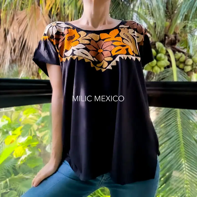 Las artesanas de Jalapa de Díaz en Oaxaca nos regalan un prenda de estilo fresco y sencillo para uso diario. Blusas artesanales mexicanas bordadas a mano en un solo lado sobre tela de rayón