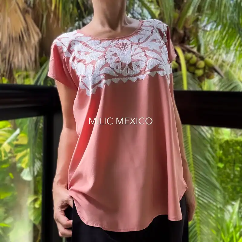 Las artesanas de Jalapa de Díaz en Oaxaca nos regalan un prenda de estilo fresco y sencillo para uso diario. Blusas artesanales mexicanas bordadas a mano en un solo lado sobre tela de rayón