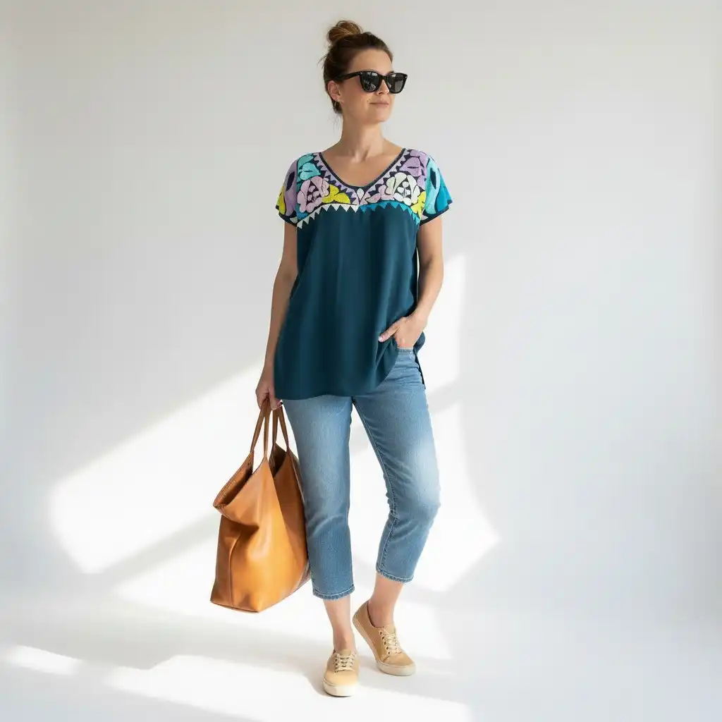 Las artesanas de Jalapa de Díaz en Oaxaca nos regalan un prenda de estilo fresco y sencillo para uso diario. Blusas artesanales mexicanas bordadas a mano en un solo lado sobre tela de rayón