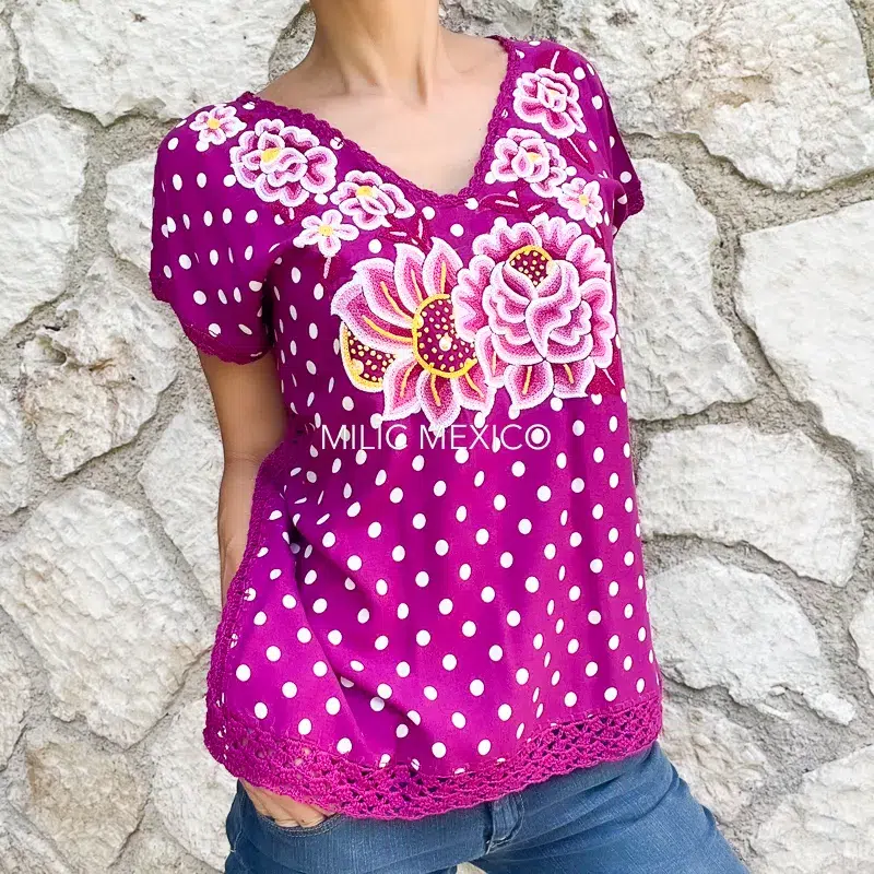 Una versión fresca de los textiles del Istmo de Tehuantepec. Las artesanas de Juchitán de Zaragoza en Oaxaca elaboran estas bellas blusas bordadas sobre tela estampada y cerradas a mano con ganchillo. Una verdadera prenda artesanal mexicana.