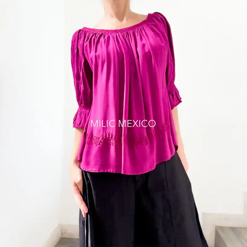Blusa artesanal mexicana con cuello y mangas fruncidas, bordada a mano en punto rococó. Origen: Aguacatenango, Chiapas.