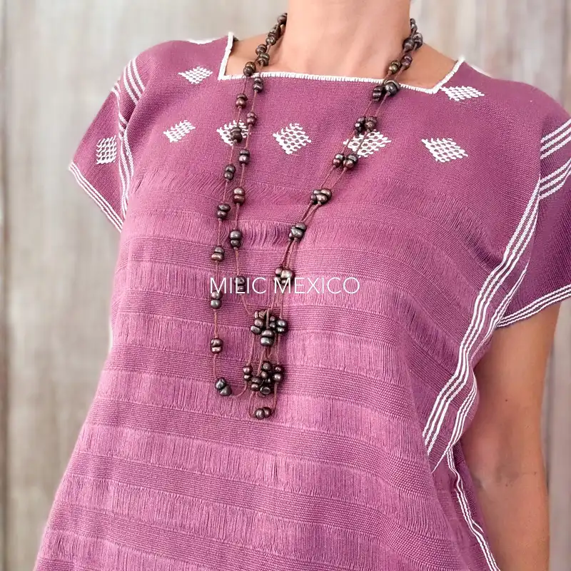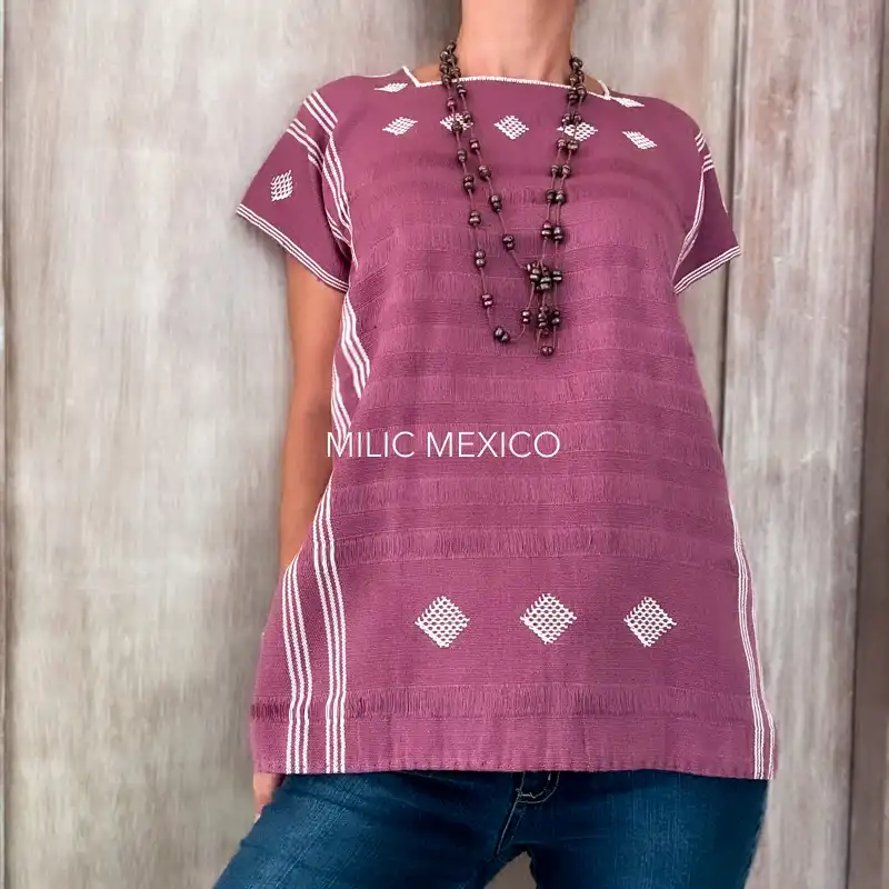 La sencillez, delicadeza y la geometría  son las bases de diseño de estas blusas artesanales mexicanas. La tradición encuentra su camino hacia la actualidad con prendas versátiles, cómodas y femeninas, pero con el sello artesanal. Tejido 100% algodón. Origen: Zinancantán, Chiapas.