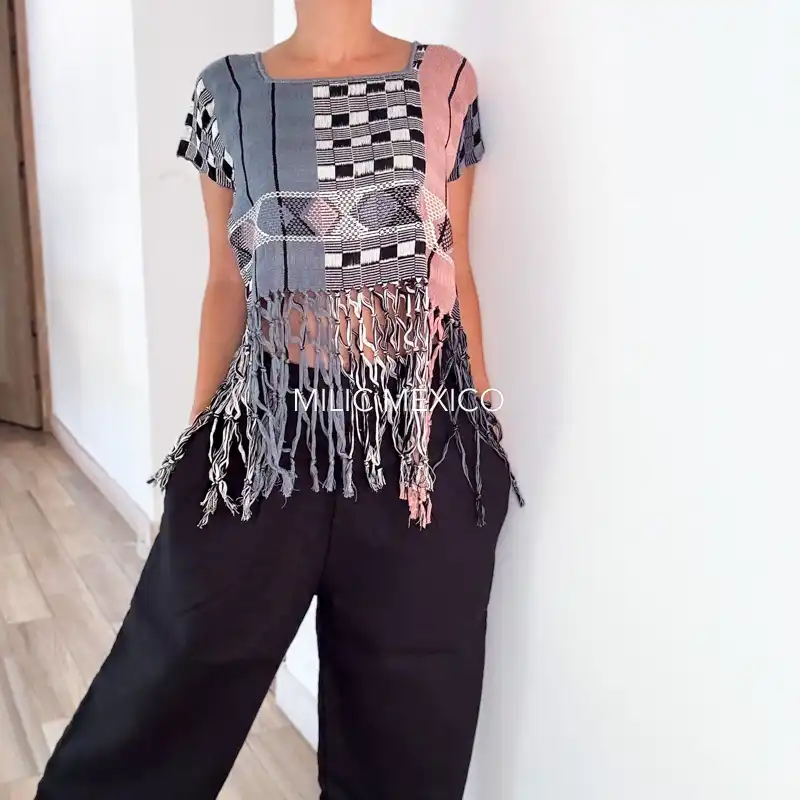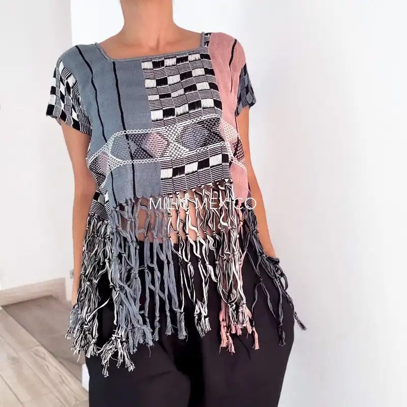 Blusas artesanales mexicanas casuales y contemporáneas, tejidas en telar de cintura con en dos tonos, con técnica de deshilado, En formato de torera con anudado en la parte inferior. 100% algodón. Origen: Zinancantán, Chiapas.