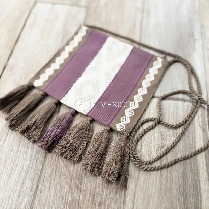 Bolsas artesanales mexicanas tejidas en telar de cintura con pompones y asa, sin forro, con cierre. Estas simpáticas y versátiles bolsitas son tejidas en San Andrés Larrainzar, Chiapas. Exterior de telar en hilo de algodón, forro interior de tela sintética.