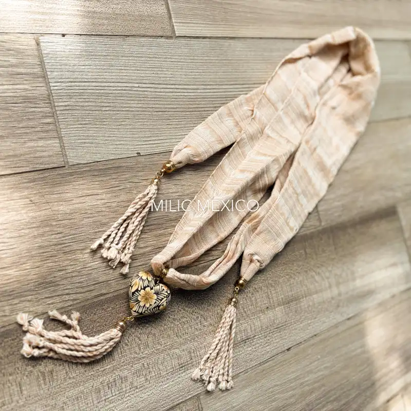 Collar artesanal para ropa mexicana elaborado con rebozo de telar y talla policromada de San Martín Tilcajete. Una belleza combinada de los Valles Centrales de Oaxaca.