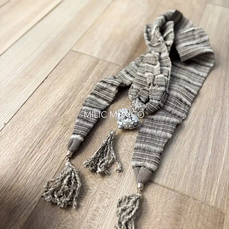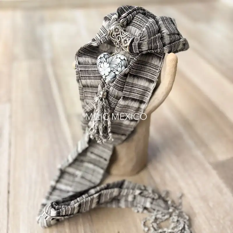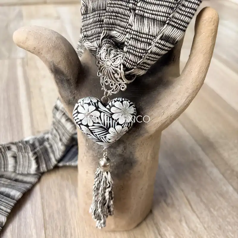 Collar artesanal para ropa mexicana elaborado con rebozo de telar y talla policromada de San Martín Tilcajete. Una belleza combinada de los Valles Centrales de Oaxaca.