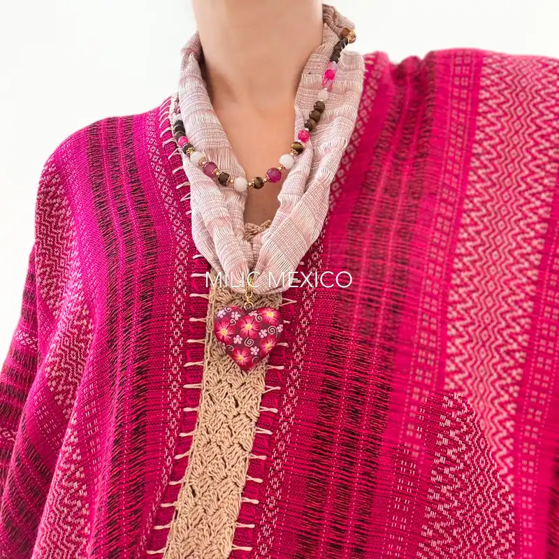 Collar artesanal para ropa mexicana elaborado con rebozo de telar y talla policromada de San Martín Tilcajete. Una belleza combinada de los Valles Centrales de Oaxaca.
