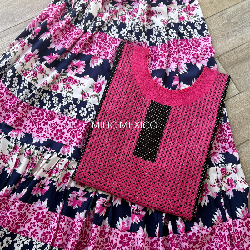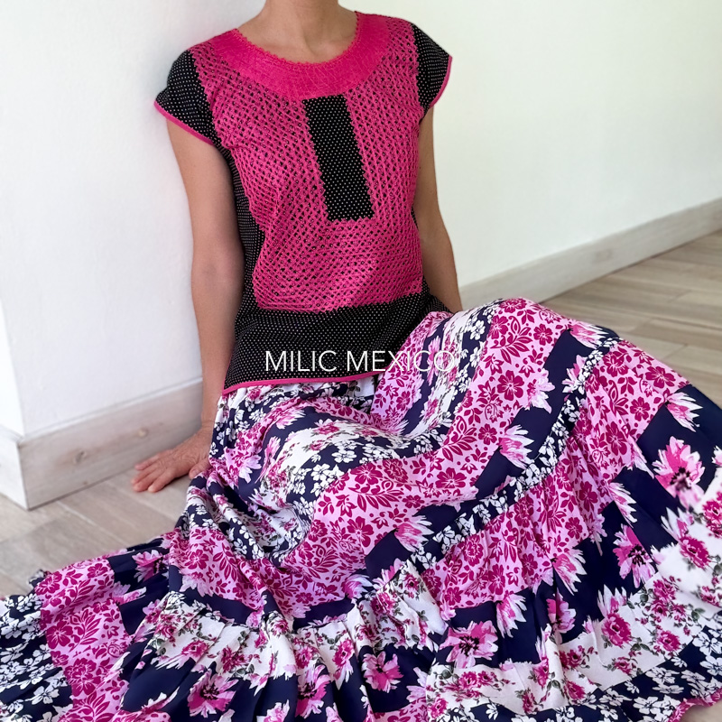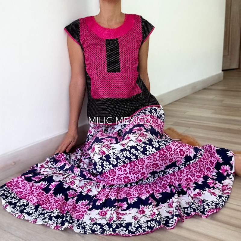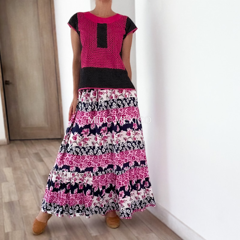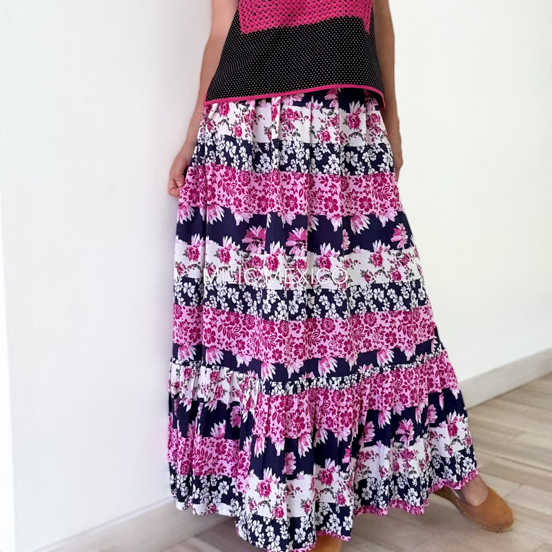 Etiquetas: Azul, Estampado, Faldas artesanales, Multicolor, Oaxaca, Rosa, San Juan Guichicovi, Talla chica, Talla grande, Talla mediana, Talla XG, Talla XXG