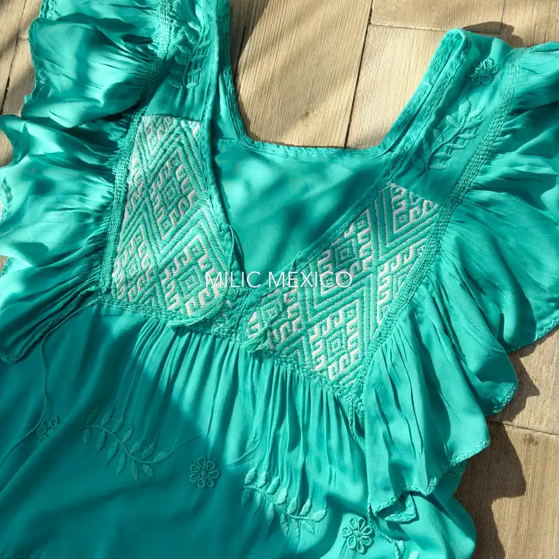 Nuestros vestidos artesanales mexicanos están completamente hechos a mano, son femeninos y cada pieza es única e irrepetible. Llevan en el pecho una aplicación de telar de cintura, olanes y plisados con puntadas y colores pensadas para dar detalle a cada prenda. Las artesanas que trabajan estas piezas no conocen el patronaje, no saben de tallas, pero con ingenio resuelven esta limitación dejando lazos de ajuste laterales y con un corte que, de forma natural, destaca la figura femenina. Son producto de la combinación de manos artesanas de dos comunidades chiapanecas: San Andrés Larrainzar y Teopisca, Chiapas.